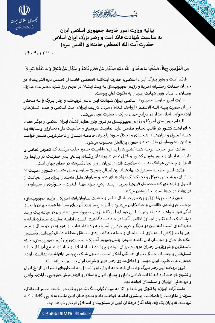 بیانیه وزرات امور خارجه جمهوری اسلامی ایران به مناسبت شهادت قائد امت و رهبر بزرگ ایران اسلامی، حضرت آیتالله العظمی امام_خامنهای (قدّس سرّه الشّریف)