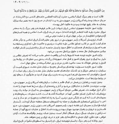 Şahsım ve büyükelçiler, maslahatgüzarlar, başkonsoloslar ve ülkemizin yurt dışındaki diğer temsilcilik başkanları dahil İran İslam Cumhuriyeti’nin tüm diplomatları, Dışişleri Bakan yardımcıları, müdürleri ve personeli, İslam Devrimi’nin üçüncü Yüce Rehberi’ne bağlılığımızı ve biatimizi ilan ediyor; büyük İran milletinin haklarını savunmak, millî çıkar ve güvenliğini ileri taşımak ve İran İslam Devrimi’nin yüce hedeflerini gerçekleştirmek uğrunda bir an olsun geri durmayacağımıza söz veriyoruz.