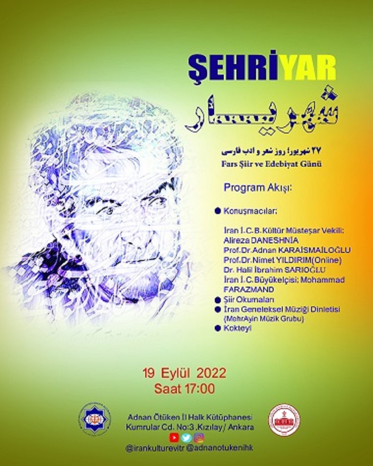 Fars şiiri ve edebiyat günü anma törenini İran İslam Cumhuriyeti Ankara Büyükelçiliği kültür müsteşarlığı tarafından, önde gelen fars edebiyatı hocaları Prof. Dr.Adnan Karaismailoğlu, Prof.Dr.Nimet Yıldırım, Dr Halil İbrahim Sarıoğlu ve İran İslam Cumhuriyeti Ankara Büuükelçisi Mohammad Farazmand  ve Kültür Müsteşar Vekili Alireza Daneshnia’nın katılımı ve konuşmalarıyla  19 Eylül 2022 SAAT 17:00!da Adnan Ötüken il halk kütüphanesinde düzenlenecektir.