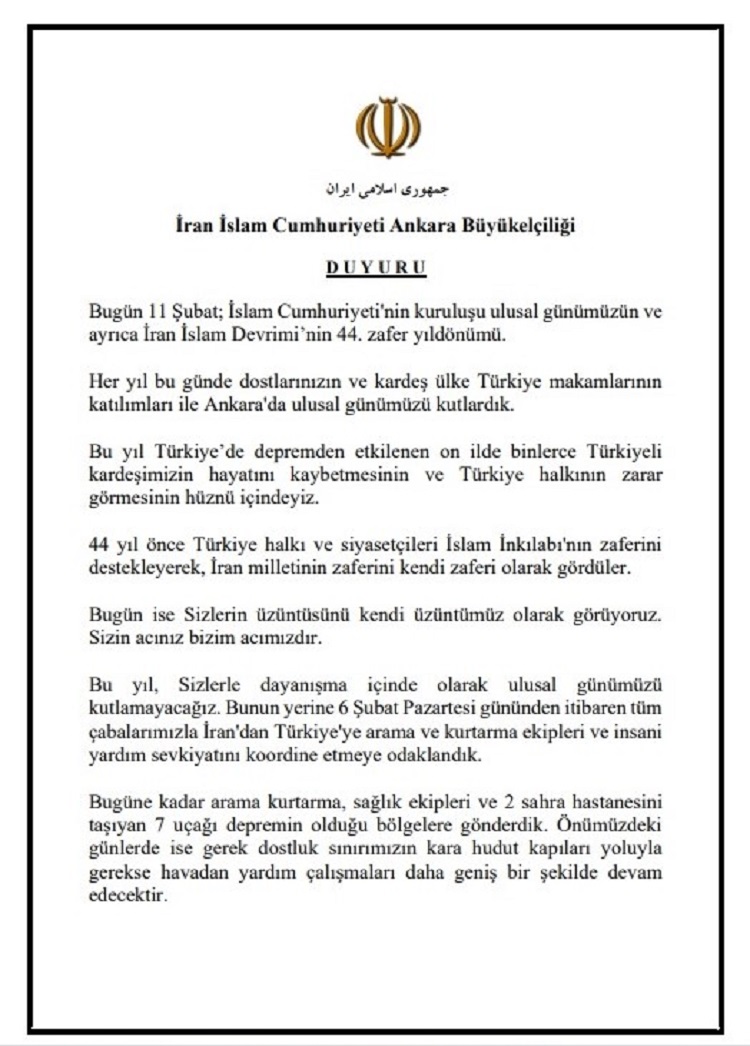 Bu yıl, Sizlerle dayanışma içinde olarak ulusal günümüzü kutlamayacağız. Bunun yerine 6 Şubat Pazartesi gününden itibaren tüm çabalarımızla İran'dan Türkiye'ye arama ve kurtarma ekipleri ve insani yardım sevkiyatını koordine etmeye odaklandık.