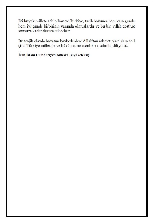 Bu trajik olayda hayatını kaybedenlere Allah'tan rahmet, yaralılara acil şifa, Türkiye milletine ve hükümetine esenlik ve sabırlar diliyoruz.